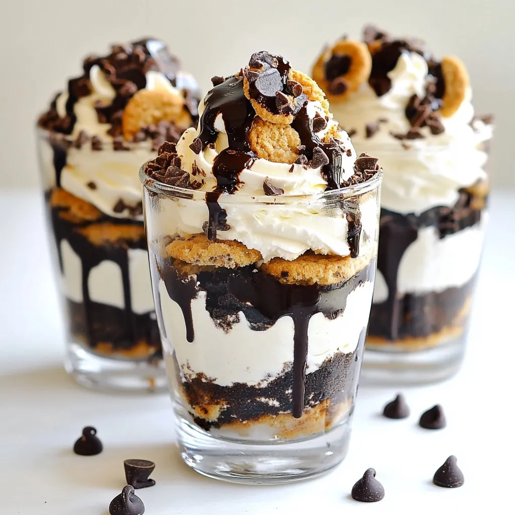- 1 cup heavy cream - 1/2 cup powdered sugar - 1 teaspoon vanilla extract - 1 cup cookies and cream ice cream, softened - 1 cup chocolate sandwich cookies, finely crushed - 1/2 cup mini chocolate chips - 1/4 cup chocolate syrup, for drizzling - Crushed chocolate sandwich cookies - Mini chocolate chips - Fresh mint sprigs - Electric mixer - Mixing bowl - Spatula - Serving glasses or parfait cups - Plastic wrap {{ingredient_image_2}} To start, grab a mixing bowl. Pour in 1 cup of heavy cream. Use an electric mixer on medium speed. Whip until soft peaks form. This means the cream will hold its shape. Next, add in 1/2 cup of powdered sugar. Also, include 1 teaspoon of vanilla extract. Keep whipping until you see stiff peaks. This means the cream is firm and ready for the next step. Now, take out 1 cup of cookies and cream ice cream. Make sure it’s softened at room temperature. Carefully fold this ice cream into the whipped cream. Use a spatula and be gentle. You want a smooth mixture with swirls of ice cream. Don’t rush this step; keep the air in the whipped cream. Get your serving glasses or parfait cups ready. Start with a spoonful of the whipped mixture. Spread it evenly at the bottom of each glass. Next, sprinkle a layer of crushed chocolate sandwich cookies. This adds a nice crunch. Drizzle some chocolate syrup over this layer. Repeat this process. Add more whipped mixture, then more crushed cookies, and more syrup. Keep layering until the glasses are full. End with the whipped cream on top. Finish by adding mini chocolate chips for extra sweetness. You can also add more crushed cookies and drizzle more chocolate syrup if you like. Cover the parfaits with plastic wrap. Place them in the fridge for at least 30 minutes. This helps the flavors mix and makes the parfaits firm. Enjoy the fun and tasty treat! To make great whipped cream, start with cold heavy cream. Use a clean bowl and beaters. Whip on medium speed until soft peaks form. Soft peaks look like little waves. Gradually add powdered sugar and vanilla. Continue to whip until you see stiff peaks. This means the cream holds its shape well. Avoid overwhipping, or it may turn grainy. Layering makes this treat look stunning. Start with the whipped cookies and cream mixture. Add it to the bottom of your glass first. Make it smooth with a spatula. Then sprinkle a layer of crushed cookies on top. Drizzle some chocolate syrup for extra flavor. Repeat this process. Each time, make sure to end with the whipped cream mixture. This creates a beautiful top layer. You can add mini chocolate chips or extra cookie crumbs on top for a fun finish. You can prepare these parfaits ahead of time. After layering, cover them with plastic wrap. Chill in the fridge for at least 30 minutes. This lets the flavors mix and the dessert firm up. You can even make them a day in advance. Just keep them covered. This way, you can serve them fresh and cool. Enjoying a delightful dessert has never been easier! Pro Tips Whip It Right: Ensure your heavy cream is cold before whipping; this helps achieve the stiff peaks necessary for a fluffy parfait. Layer It Up: For the best presentation, use clear glasses to showcase the beautiful layers of the parfait. Chill Out: Allow the parfaits to chill for at least 30 minutes in the fridge; this helps the flavors meld and improves the texture. Customize Your Crunch: Feel free to mix different types of crushed cookies or add nuts for added texture and flavor variations. {{image_4}} You can change up the ice cream for fun. Try using vanilla, chocolate, or mint chocolate chip. Each flavor gives a new twist to the parfaits. Vanilla adds a classic taste, while chocolate boosts the richness. Mint chocolate chip adds a refreshing feel. Feel free to experiment and find your favorite! While chocolate sandwich cookies are great, you can use other cookies too. Think about using Oreos, chocolate chip, or graham crackers. Each type adds its own flavor and texture. For a fruity kick, try crushed fruit-flavored cookies. The options are endless, so get creative! Toppings make your parfaits even better. Try adding nuts, sprinkles, or whipped cream. Fresh fruit like strawberries or bananas can add a burst of flavor. Consider drizzling caramel or peanut butter for extra richness. These toppings not only taste amazing, but also make your parfaits visually stunning! Store your Baileys Cookies & Cream Parfaits in the fridge. Use airtight containers or cover them with plastic wrap. This helps keep them fresh and tasty. Avoid letting air get in, as it can spoil the parfaits. Place them on a shelf in the fridge, not in the door. This keeps them cool and stable. These parfaits stay fresh for up to three days in the fridge. After three days, the whipped cream may start to lose its texture. If you want the best taste, try to eat them within two days. They are best enjoyed when fresh and creamy. You can freeze these parfaits for later. To freeze, place them in freezer-safe containers. Make sure to leave space at the top for expansion. When you're ready to eat, let them thaw overnight in the fridge. Avoid refreezing once they are thawed. This helps maintain the creamy texture and flavor. Yes, you can use whipping cream instead of heavy cream. Whipping cream has less fat, which means it may not whip as stiffly. Your parfaits will still taste great. If you want a lighter option, try using half-and-half. It won’t whip as well but will add creaminess. Absolutely! You can make these parfaits without Baileys. Just leave out the Baileys and replace it with a splash of milk or cream. You can also add a bit of vanilla extract to keep that sweet flavor. Your parfaits will still be delicious and creamy. Serve these parfaits in clear glasses to show off the layers. Add a sprig of mint on top for color. You can also use extra crushed cookies as a garnish. For a fun twist, try adding whipped cream on top before serving. Enjoy these parfaits chilled for the best taste