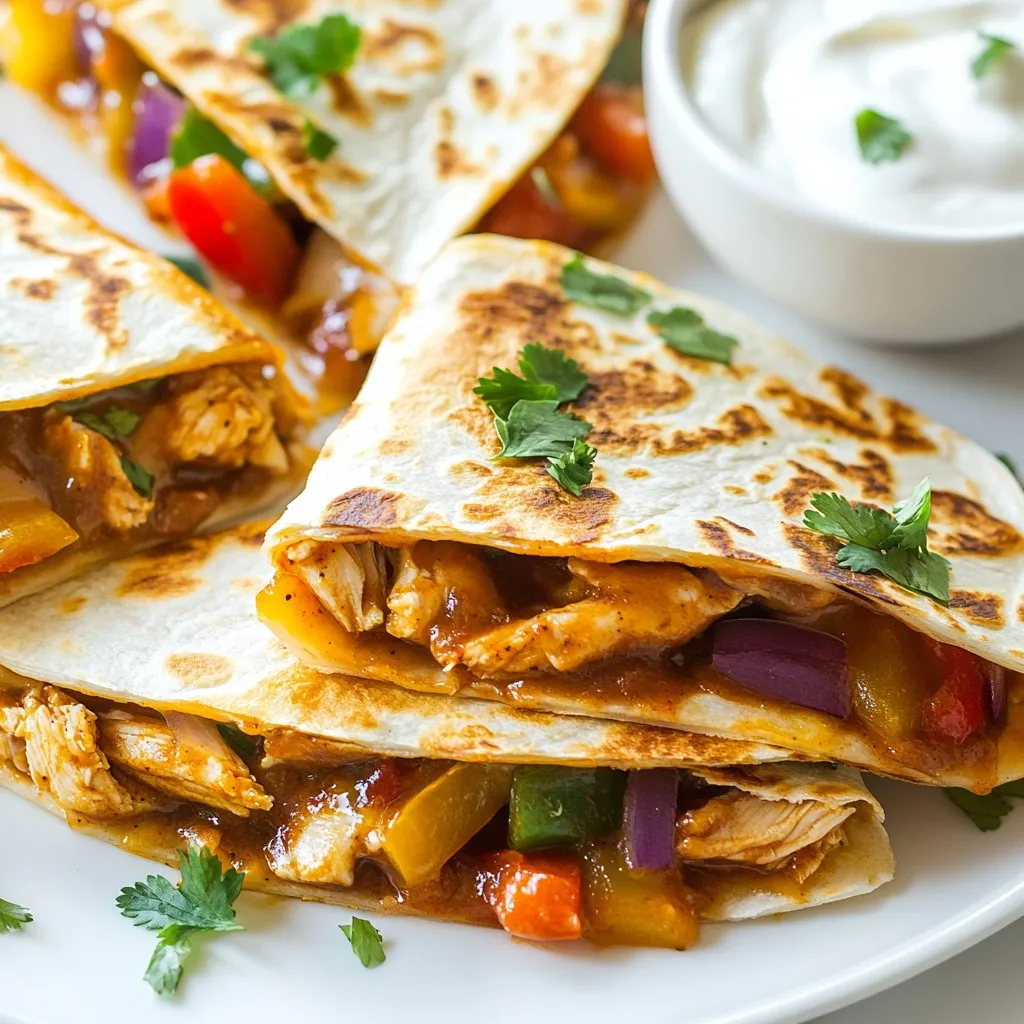 Delicious quesadillas filled with BBQ chicken, cheese, and sautéed vegetables.