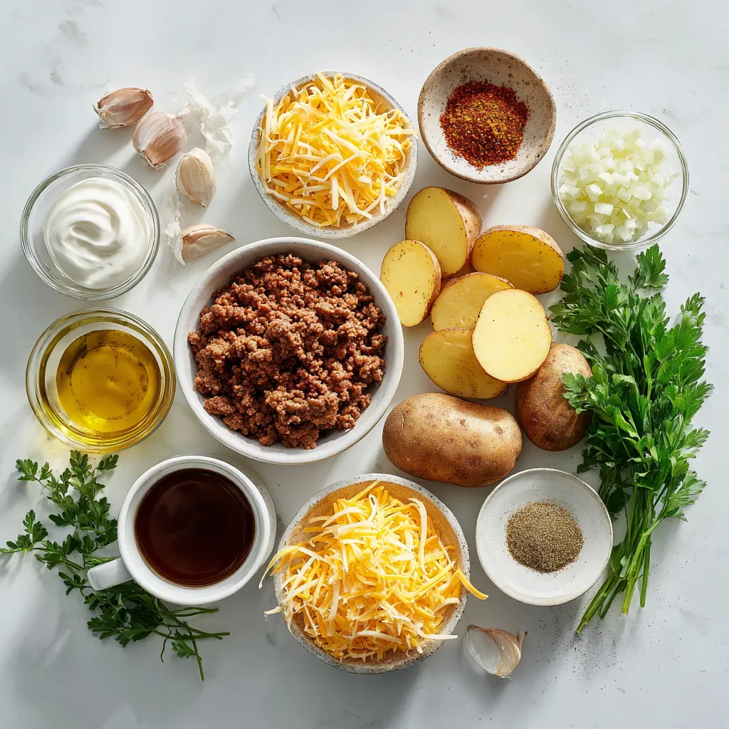 The main ingredients create the heart of this dish. Ground beef gives it protein, while potatoes add comfort. The cheeses provide that rich, creamy taste we love.