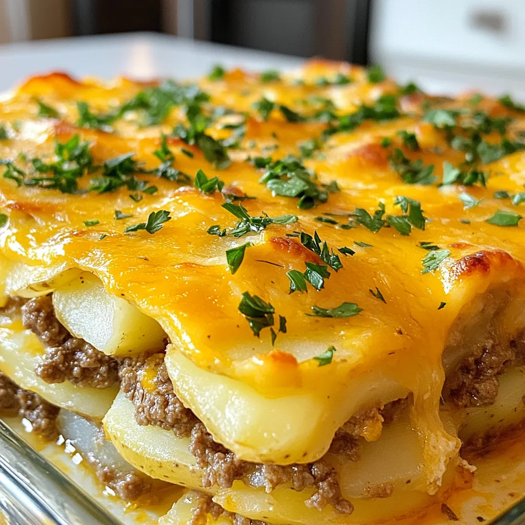 A hearty and comforting casserole made with layers of ground beef, potatoes, and cheese.