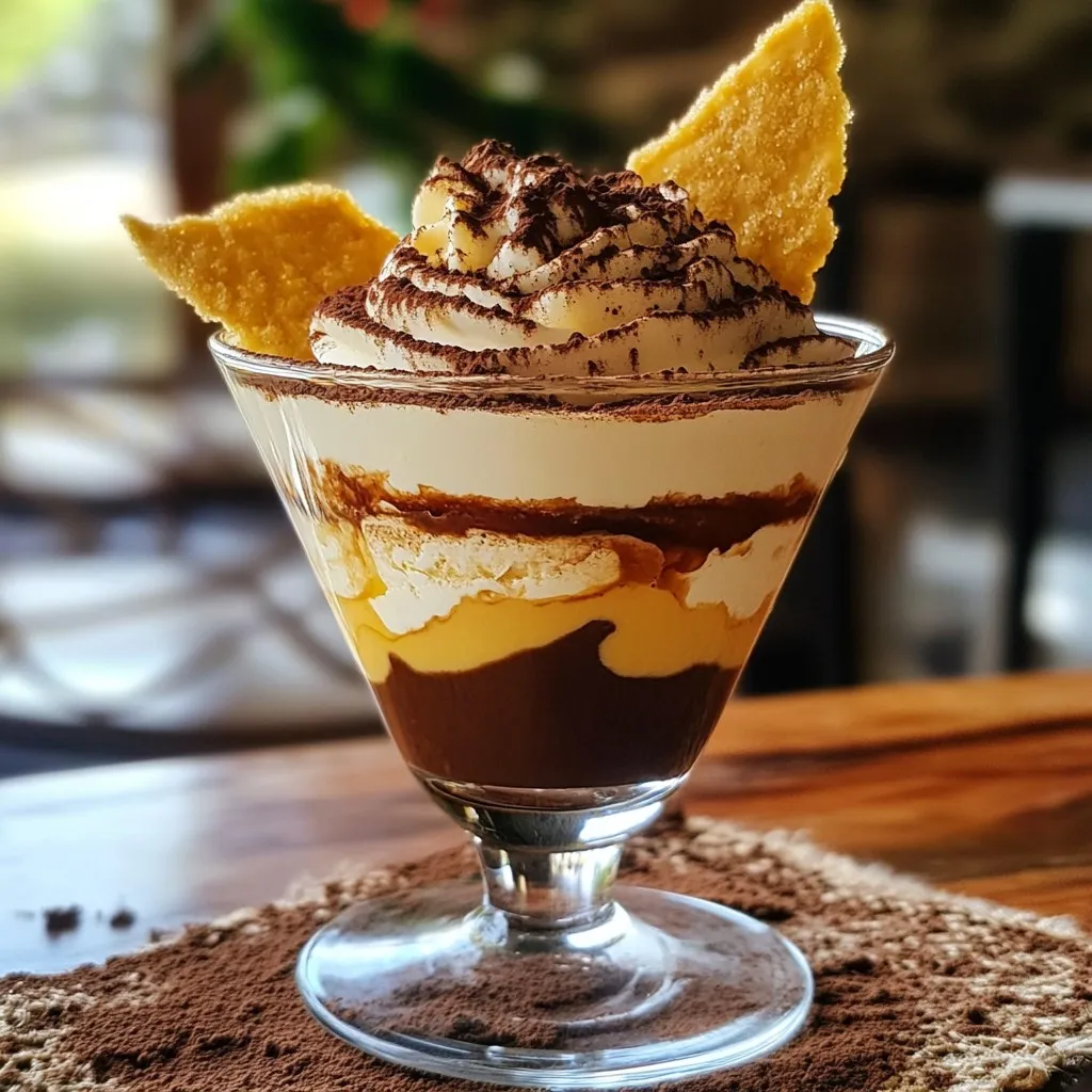 To finish, liberally dust the top layer with cocoa powder for a beautiful contrast. Garnish each glass with a ladyfinger cookie standing upright on the rim, and sprinkle a few dark chocolate shavings on top for an elegant touch.