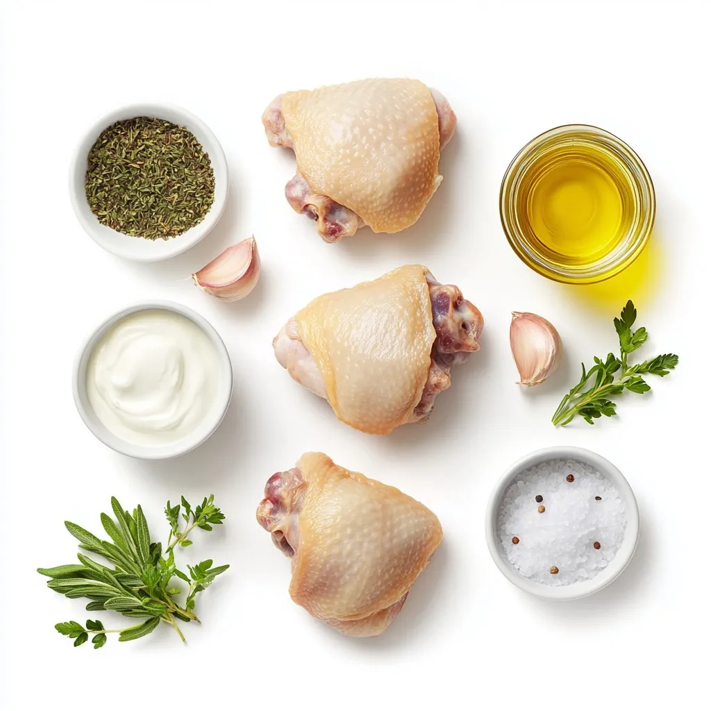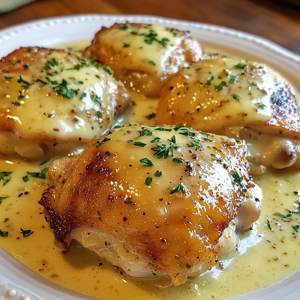 - 4 bone-in, skin-on chicken thighs - 1 cup heavy cream - 2 tablespoons olive oil The heart of this dish is the chicken thighs. I love using bone-in, skin-on pieces. They stay juicy and have great flavor. The heavy cream makes the sauce rich and smooth. Olive oil helps with browning the chicken. - 4 cloves garlic, minced - 1 teaspoon dried thyme - 1 teaspoon dried rosemary - Salt and freshly ground pepper to taste Garlic adds a strong, tasty punch. Thyme and rosemary bring warmth and earthiness. Salt and pepper balance all the flavors. I always recommend tasting as you go. It helps you find the right seasoning. - Fresh parsley Fresh parsley is not just for looks. It adds a fresh taste that brightens the dish. A sprinkle on top makes it pop on the plate. This small touch can elevate your meal. {{ingredient_image_2}} 1. Preheat the oven: Start by preheating your oven to 375°F (190°C). This step gets your oven hot and ready for the chicken. 2. Seasoning the chicken: While the oven heats, take your chicken thighs. Generously season both sides with salt and freshly ground pepper. This adds flavor that makes the dish shine. 1. Searing process: In a large, oven-safe skillet, heat 2 tablespoons of olive oil over medium-high heat. Once the oil is hot, place the chicken thighs into the skillet skin-side down. 2. Flipping and browning: Let the chicken sear for 5 to 7 minutes. You want the skin to be a lovely golden brown. After that, use tongs to flip the chicken and cook for another 5 minutes. This step gives the chicken a nice crust. 1. Sautéing garlic: After browning the chicken, remove it from the skillet. In the same pan, reduce the heat to medium. Add 4 minced garlic cloves and sauté for about 1 minute. Stir often, but don’t let the garlic brown. 2. Deglazing with chicken broth: Pour in 1 cup of chicken broth. Use a wooden spoon to scrape up any tasty bits stuck to the bottom of the pan. This makes your sauce rich and full of flavor. Bring the mixture to a gentle simmer. 3. Incorporating the cream and seasonings: Next, stir in 1 cup of heavy cream, along with 1 teaspoon of dried thyme and 1 teaspoon of dried rosemary. Taste and adjust the seasoning as needed. Let the sauce simmer for 3 to 4 minutes, until it thickens slightly. Now your creamy garlic chicken dish is almost ready! To get crispy skin on chicken thighs, start by patting them dry with a paper towel. The dryer the skin, the better it will crisp up. Season both sides well with salt and pepper before searing. This helps enhance the flavor. Check for doneness by using a meat thermometer. The internal temperature should reach 165°F (75°C). If you don’t have a thermometer, cut into the thickest part of the thigh. The juices should run clear, not pink. To thicken the sauce, let it simmer longer. This reduces the liquid and creates a creamy texture. If it’s still not thick enough, whisk in a little cornstarch mixed with cold water. This will help it set up nicely. Adjust the flavors to suit your taste. If you want more garlic, add an extra clove. For a bit of tang, squeeze in some lemon juice. Always taste before serving to ensure it meets your liking. For serving, place the creamy garlic chicken thighs on a bed of fluffy mashed potatoes. The sauce will soak into the potatoes, adding flavor. You can also serve it next to vibrant steamed vegetables like broccoli or carrots. To garnish your plate, sprinkle fresh parsley on top. This adds a pop of color and freshness. You can also add lemon wedges on the side for extra flair. Pro Tips Perfect Searing: For the best crispy skin, make sure your skillet is hot enough before adding the chicken. This will help achieve a golden brown crust. Flavor Boost: Consider adding a splash of white wine after deglazing the skillet for an extra layer of flavor in your creamy sauce. Thicker Sauce: If you prefer a thicker sauce, allow it to simmer longer after adding the cream, or you can add a teaspoon of cornstarch mixed with a little water. Garnish for Freshness: Fresh herbs not only add color but also enhance the dish’s flavor. Try using fresh thyme or basil in addition to parsley for a fresh twist. {{image_4}} You can easily boost the flavors of creamy garlic chicken thighs. One great idea is to add lemon zest or lemon juice. This adds a bright taste that cuts through the creaminess. Just a teaspoon of zest or a tablespoon of juice works wonders. Another tasty twist is to incorporate spinach or mushrooms. Sauté fresh spinach until it wilts, or add sliced mushrooms to the garlic. Both options enrich the dish with color and nutrients. If you prefer, you can try a stovetop-only version. After searing the chicken, simply simmer the thighs in the sauce on low heat. This keeps the dish simple and fast. For a hands-off approach, use a slow cooker. Sear the chicken first for flavor, then transfer it to the slow cooker with the sauce. Cook on low for 4-6 hours. The chicken will be tender and full of flavor. For a low-carb option, replace the heavy cream with coconut cream or use a low-carb milk. This keeps the dish creamy without adding too many carbs. If you need a dairy-free alternative, you can swap the cream for almond milk or cashew cream. This ensures everyone can enjoy this rich and flavorful dish. To store leftovers, let the chicken cool to room temperature. Place it in an airtight container. Make sure to include some of the creamy sauce for flavor. You can keep it in the fridge for up to 3 days. For freezing, use a freezer-safe container. You can also use freezer bags for easy storage. Remove as much air as possible to avoid freezer burn. This dish can last up to 3 months in the freezer. When ready to eat, thaw it in the fridge overnight. Reheat it on the stovetop over low heat. Add a splash of cream if the sauce is too thick. You can prepare creamy garlic chicken thighs in advance. Cook a batch on the weekend and store it for the week. It pairs well with rice, quinoa, or pasta. You can also 