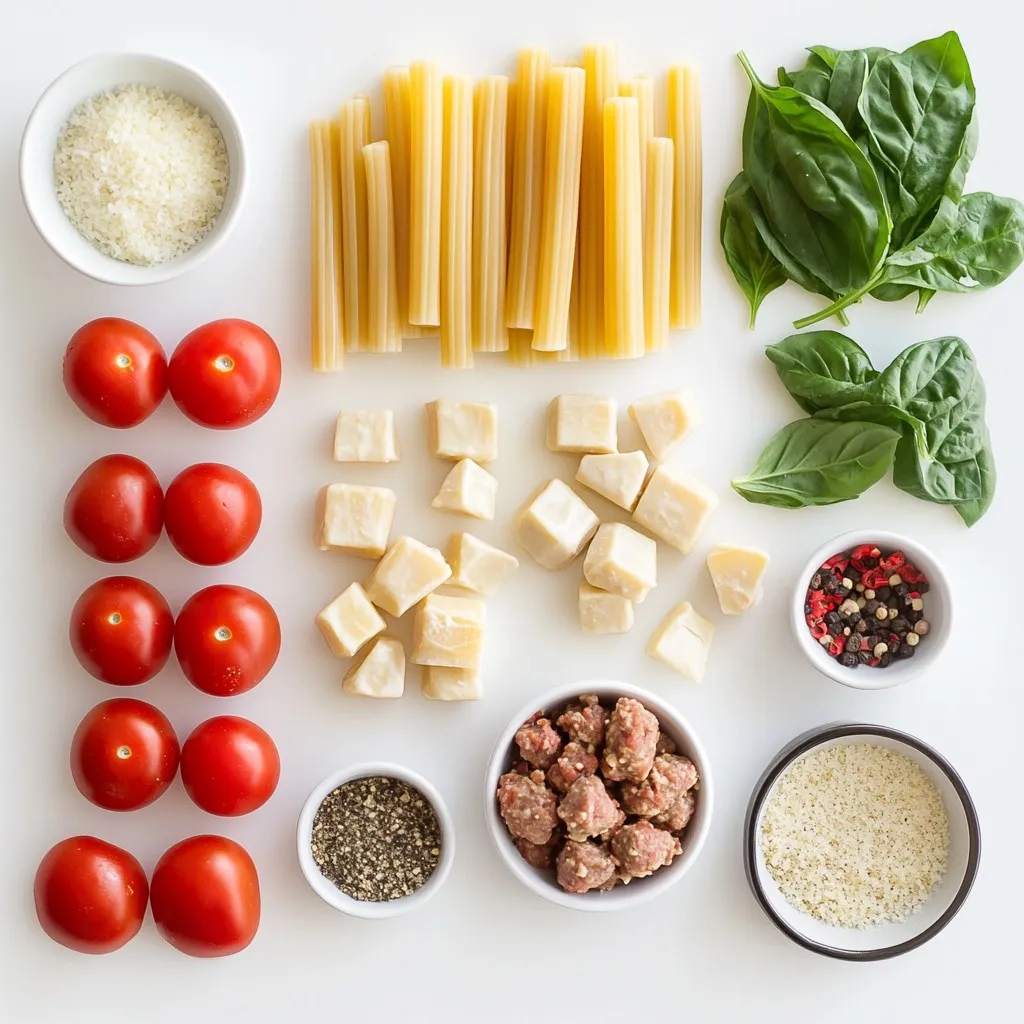 - 12 oz rigatoni pasta - 1 lb Italian sausage (mild or spicy, casings removed) - 1 medium onion, finely chopped - 3 cloves garlic, minced - 1 cup heavy cream - 1 cup chicken broth - ½ cup freshly grated Parmesan cheese - 1 cup cherry tomatoes, halved - 1 cup fresh spinach, roughly chopped - 1 teaspoon Italian seasoning - ½ teaspoon red pepper flakes (optional) - 2 tablespoons extra virgin olive oil - Salt and freshly cracked black pepper to taste The ingredients for creamy Italian sausage rigatoni create a rich and tasty dish. First, rigatoni pasta provides a nice, bite-sized shape. You can pick between mild or spicy Italian sausage. This choice shapes the dish's flavor. Next, we have aromatics. Onions and garlic add depth. They enhance the overall taste when sautéed together. Heavy cream makes the sauce rich and smooth. Chicken broth adds flavor and helps to balance the creaminess. Parmesan cheese brings a savory touch. You’ll want to use freshly grated cheese for the best result. For vegetables, cherry tomatoes add sweetness. They burst with flavor when cooked. Fresh spinach brings color and nutrition. Adding Italian seasoning and red pepper flakes gives a lovely kick. Finally, olive oil, salt, and pepper tie all these ingredients together. This dish is simple yet satisfying, perfect for any dinner! {{ingredient_image_2}} To start, fill a large pot with water. Add a generous amount of salt. Bring the water to a vigorous boil over high heat. This helps flavor the pasta. Once boiling, add 12 oz of rigatoni. Cook it according to the package instructions. Aim for that perfect al dente texture. Check it a minute before the time is up. You want the pasta firm yet cooked. After cooking, save 1 cup of pasta water. Drain the rigatoni and set it aside in a large bowl. Next, grab a spacious skillet. Heat 2 tablespoons of extra virgin olive oil over medium heat. Once hot, add 1 lb of Italian sausage. Make sure to remove the casings first. With a wooden spoon, break the sausage into smaller pieces. This step helps it cook evenly. Brown the sausage for about 5-7 minutes. Stir occasionally until it turns a lovely golden brown and is fully cooked. Now, it’s time to create the creamy sauce. To the skillet, add 1 medium chopped onion and 3 minced garlic cloves. Sauté for about 3-4 minutes. You want the onion to become translucent and aromatic. Then, pour in 1 cup of chicken broth and 1 cup of heavy cream. Stir well to combine. Let the mixture come to a gentle simmer. After that, add in 1 cup of halved cherry tomatoes and 1 cup of chopped spinach. Include 1 teaspoon of Italian seasoning and ½ teaspoon of red pepper flakes if you like some heat. Season with salt and pepper to taste. Cook everything for another 5 minutes. This allows the tomatoes to soften and the spinach to wilt perfectly into the sauce. Once your sauce is ready, introduce the cooked rigatoni into the skillet. Toss it gently so every piece is coated in the creamy sauce. If the sauce looks too thick, use that reserved pasta water. Add it slowly, a little at a time, until you reach the desired consistency. Finally, mix in ½ cup of freshly grated Parmesan cheese. Stir until it melts and creates a rich, creamy texture. Taste and adjust the seasoning if needed. Serve your creamy rigatoni in shallow bowls, garnished with fresh basil leaves. Enjoy this delightful dish! - For great pasta, choose a large pot. Fill it with water and add salt. - Bring the water to a strong boil before adding rigatoni. This helps cook evenly. - Stir the pasta often to prevent it from sticking. Cook until it’s al dente. - To avoid overcooking the sausage, use medium heat. Cook until browned, about 5-7 minutes. - Break the sausage into smaller pieces for even cooking and flavor. - To boost flavor, add herbs like thyme or oregano. Fresh herbs work best. - For a spicy kick, try more red pepper flakes or crushed red pepper. - To amp up creaminess, mix in cream cheese or mascarpone with the heavy cream. - Add a splash of lemon juice for brightness. It balances the richness of the dish. - For a nice presentation, drizzle olive oil over the plated dish. - Sprinkle extra Parmesan cheese on top for added flavor and elegance. - Garnish with fresh basil leaves for a pop of color. - Pair with a crisp white wine like Pinot Grigio or a side salad for freshness. - Garlic bread makes a great side for soaking up the creamy sauce. Pro Tips Choose Your Sausage Wisely: Select a high-quality Italian sausage for the best flavor. If you prefer a less spicy dish, go for mild sausage, or if you like a kick, choose spicy sausage. Don’t Skip the Pasta Water: The starchy pasta water is a great way to achieve a creamy sauce consistency. Add it gradually until you reach your desired texture. Add Fresh Herbs: Fresh basil not only adds color but also enhances the flavor profile of the dish. Consider adding it just before serving to maintain its vibrant flavor. Customize Your Veggies: Feel free to toss in other vegetables like bell peppers or zucchini for added nutrition and flavor. Just adjust the cooking time accordingly. {{image_4}} You can easily swap out the Italian sausage. Try using chicken or turkey sausage. These options are leaner but still pack great flavor. If you want a meat-free dish, plant-based sausage works well too. Many brands offer tasty alternatives that mimic the texture and taste of meat. Want to change the spice level? You can add different types of peppers. For a sweeter taste, use bell peppers. If you like heat, try jalapeños or serrano peppers. You can also add vegetables like zucchini or bell peppers. They add color and nutrition to your dish. For gluten-free options, choose pasta made from rice or corn. Many brands offer gluten-free rigatoni that tastes great. If you want a low-calorie meal, reduce the amount of cream and cheese. You can use low-fat cream or even a dairy-free milk. This way, you can still enjoy a creamy sauce without the extra calories. To 