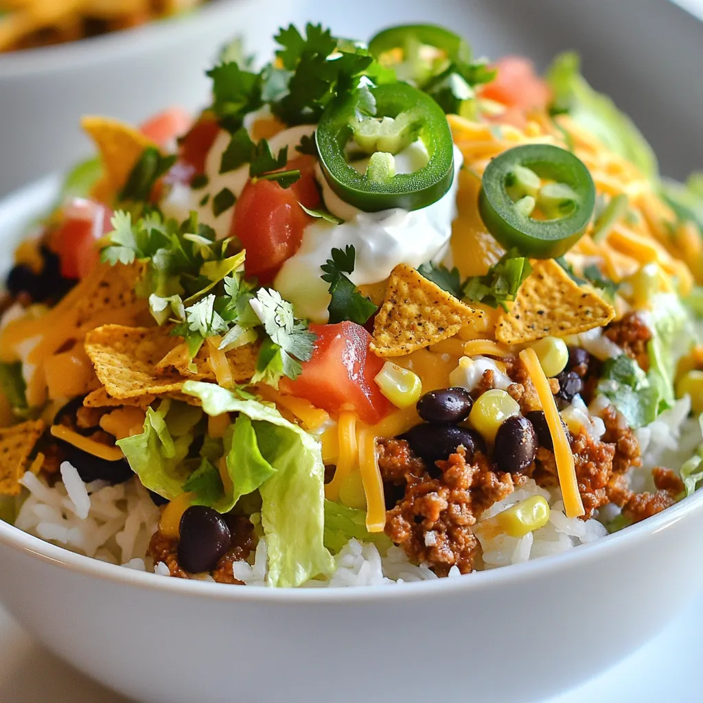 Now it’s time to build your taco rice bowl! Start by layering the rice mixture at the bottom of your serving bowls. Next, spoon the seasoned meat over the rice, creating a nice second layer. Then, sprinkle shredded cheddar cheese on top. The heat from the meat will help it melt just a bit. After that, add a layer of shredded lettuce. Top it off with dollops of sour cream. If you enjoy a kick, add sliced jalapeños. Finally, finish with a handful of crushed Doritos for that crunchy touch. Garnish with fresh cilantro for color and flavor. Enjoy your delicious creation!