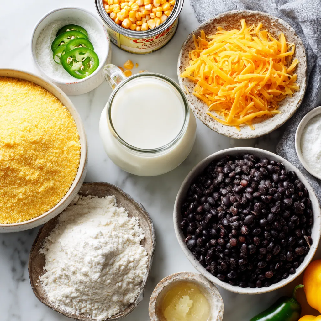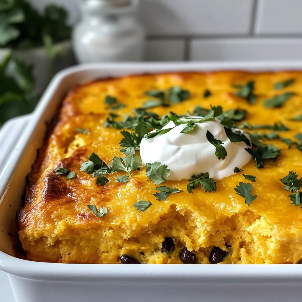 A warm and comforting cornbread casserole with a blend of corn, black beans, and cheese, perfect for a cozy meal.