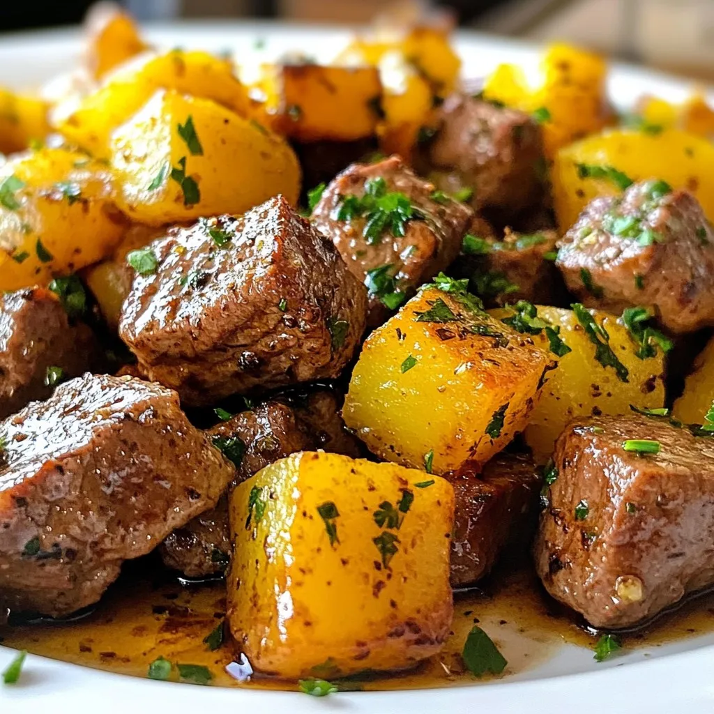 Here’s what you need for Garlic Butter Beef Bites with Potatoes: - 1 lb (450g) beef sirloin, cut into bite-sized cubes - 2 cups baby potatoes, halved - 4 tablespoons unsalted butter - 5 cloves garlic, minced - 1 teaspoon fresh rosemary, finely chopped - 1 teaspoon fresh thyme, finely chopped - Salt and pepper to taste - 1 tablespoon olive oil - Fresh parsley, chopped, for garnish This list packs a punch of flavor! The beef sirloin gives a tender bite, while baby potatoes add a comforting base. Unsalted butter and garlic bring richness and aroma. Fresh herbs like rosemary and thyme enhance the dish's taste. Olive oil helps the potatoes roast perfectly. Finally, salt and pepper are key for seasoning, and fresh parsley adds the finishing touch. With these ingredients, you can create a dish that is both hearty and delicious. Feel free to explore and adjust the herbs or seasoning to match your taste. Enjoy cooking! {{ingredient_image_2}} Set your oven to 400°F (200°C). This heat helps the potatoes roast well and become crispy. In a big bowl, mix the halved baby potatoes with olive oil. Add a pinch of salt and pepper. Toss in the fresh chopped rosemary and thyme. Mix everything until the potatoes are covered in seasoning. Spread the seasoned potatoes on a baking sheet in a single layer. Roast them in the oven for 20-25 minutes. Flip them halfway to ensure even browning. They should be golden and tender when done. While the potatoes roast, season your beef cubes with salt and pepper. Make sure to coat them well for the best flavor. In a large skillet, melt the butter over medium heat. Add minced garlic and sauté for about one minute until it smells great. Increase the heat to high and add the beef cubes. Sear them for 2-3 minutes on each side. Look for a nice brown crust and cook them to your liking. Once the beef is cooked, remove it from heat. Toss the beef cubes in the garlic butter, making sure they are well coated. Take the roasted potatoes out of the oven. Optionally, you can add a little extra salt to the potatoes. Serve the beef bites alongside the potatoes. Garnish with fresh chopped parsley for a colorful touch. Enjoy your meal! For this dish, I recommend using beef sirloin. It has great flavor and tenderness. Look for a cut with some marbling. This adds juiciness to the beef bites. Trim off any excess fat before cutting it into cubes. This makes cooking easier and keeps the dish healthy. Use baby potatoes for a soft and creamy texture. Halve them for even cooking. Toss the potatoes with olive oil, salt, and herbs. This gives them a tasty flavor. Spread them on a baking sheet in a single layer. Flip them halfway through cooking. This helps them brown evenly and prevents sticking. When seasoning, taste as you go. Start with salt and pepper, then add herbs. Fresh rosemary and thyme work well in this dish. If you want a kick, try adding red pepper flakes. For a richer taste, consider adding garlic powder or onion powder. This way, you can find the perfect balance for your palate. Pro Tips Rest the Beef: Allow the seared beef to rest for a few minutes before serving. This helps retain the juices, resulting in a more tender and flavorful bite. Use High Heat: For a perfect sear on the beef, make sure your skillet is hot enough. This creates a nice crust while keeping the inside juicy. Experiment with Herbs: Feel free to mix and match herbs according to your preference. Thyme, oregano, or tarragon can all bring a unique flavor to the dish. Garnish Strategically: When garnishing with parsley, consider using a mix of parsley and other fresh herbs to add color and complexity to your dish. {{image_4}} You can swap baby potatoes for other veggies. Try carrots, green beans, or bell peppers. Cut them to a similar size for even cooking. The flavors will change but stay delicious. Each vegetable brings a new taste and texture to the dish. Add unique spices to your beef bites. Consider smoked paprika, cumin, or chili powder. These spices can give your dish a bold twist. You can also try sauces like teriyaki or barbecue. Brush them on the beef while cooking for extra flavor. Serve garlic butter beef bites with a fresh salad or steamed vegetables. Rice or crusty bread also works well. Each side will complement the rich flavors of the beef and potatoes. Create a balanced meal with a mix of textures and tastes. Store any leftovers in the fridge for up to three days. You can make a tasty sandwich with the beef bites. Just add some cheese and veggies. Or, toss the beef and potatoes into a stir-fry for a quick meal. The options are endless! To keep your garlic butter beef bites with potatoes fresh, store them in an airtight container. Place the beef and potatoes together if you can. They taste best within three days. Make sure to let them cool down before sealing the container. This helps keep their flavor intact. When you're ready to enjoy leftovers, use a skillet or microwave. If using a skillet, add a bit of butter over medium heat. Heat until warm, stirring occasionally. If you prefer a microwave, place the beef and potatoes on a microwave-safe plate. Cover with a damp paper towel and heat in 30-second bursts until hot. Be careful not to overheat, or the beef may dry out. You can freeze the beef bites and potatoes if you want to save them for later. Place them in a freezer-safe bag or container. Make sure to remove as much air as possible. They can stay fresh for up to three months. To thaw, move them to the fridge a day before you plan to eat them. Reheat as mentioned above for the best results. Yes, you can prepare the beef and potatoes ahead. Cook the beef bites and roast the potatoes. Let them cool and store them in the fridge. When you're ready to eat, just reheat in the oven. This keeps the flavors fresh. If you want to swap out beef sirloin, try using tender cuts like filet mignon or ribeye. You can also use chicken or pork for a different taste. Just make sure to adjust cooking times based o