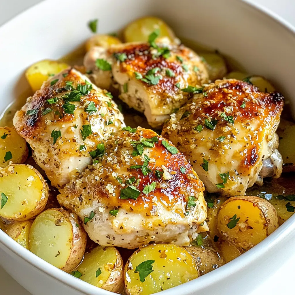 Serve the chicken and potatoes on a nice platter. Drizzle some cooking juices over them. This keeps everything moist and adds shine. Finish with a sprinkle of fresh parsley. It adds color and freshness to the dish.