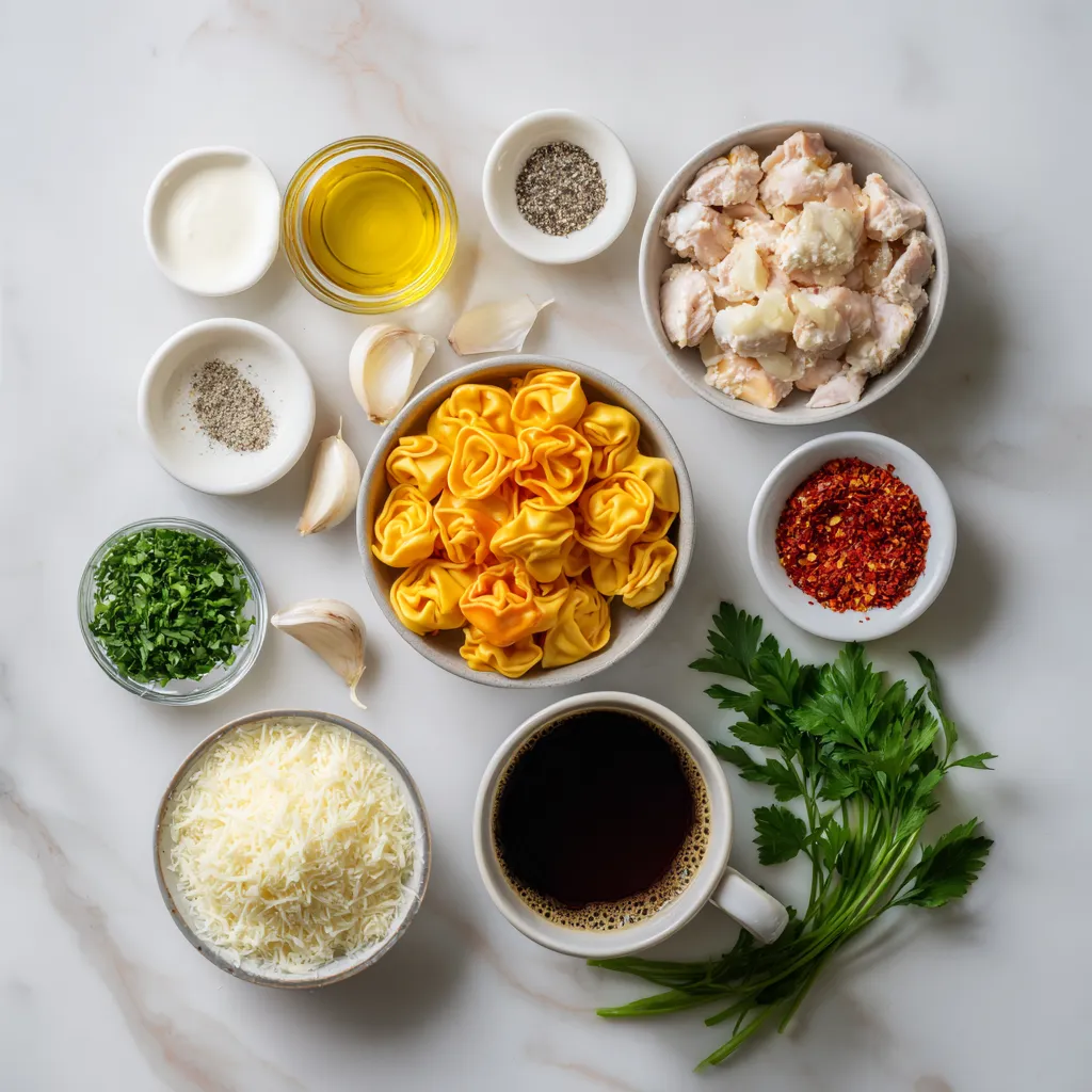 To make Garlic Parmesan Tortellini with Chicken, gather all the ingredients. It’s important to have fresh cheese tortellini for the best taste. You can use frozen tortellini if that’s what you have.