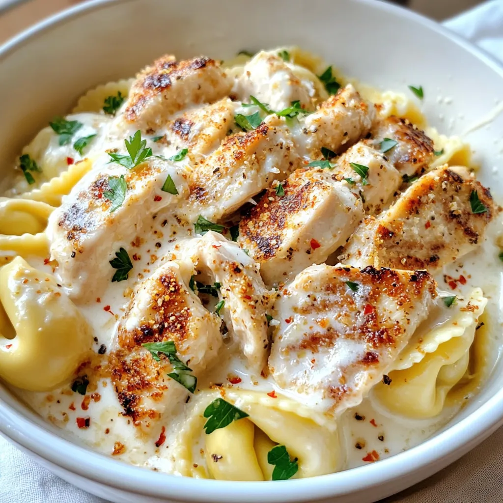 A creamy and flavorful dish featuring cheese tortellini, tender chicken, and a rich garlic Parmesan sauce.