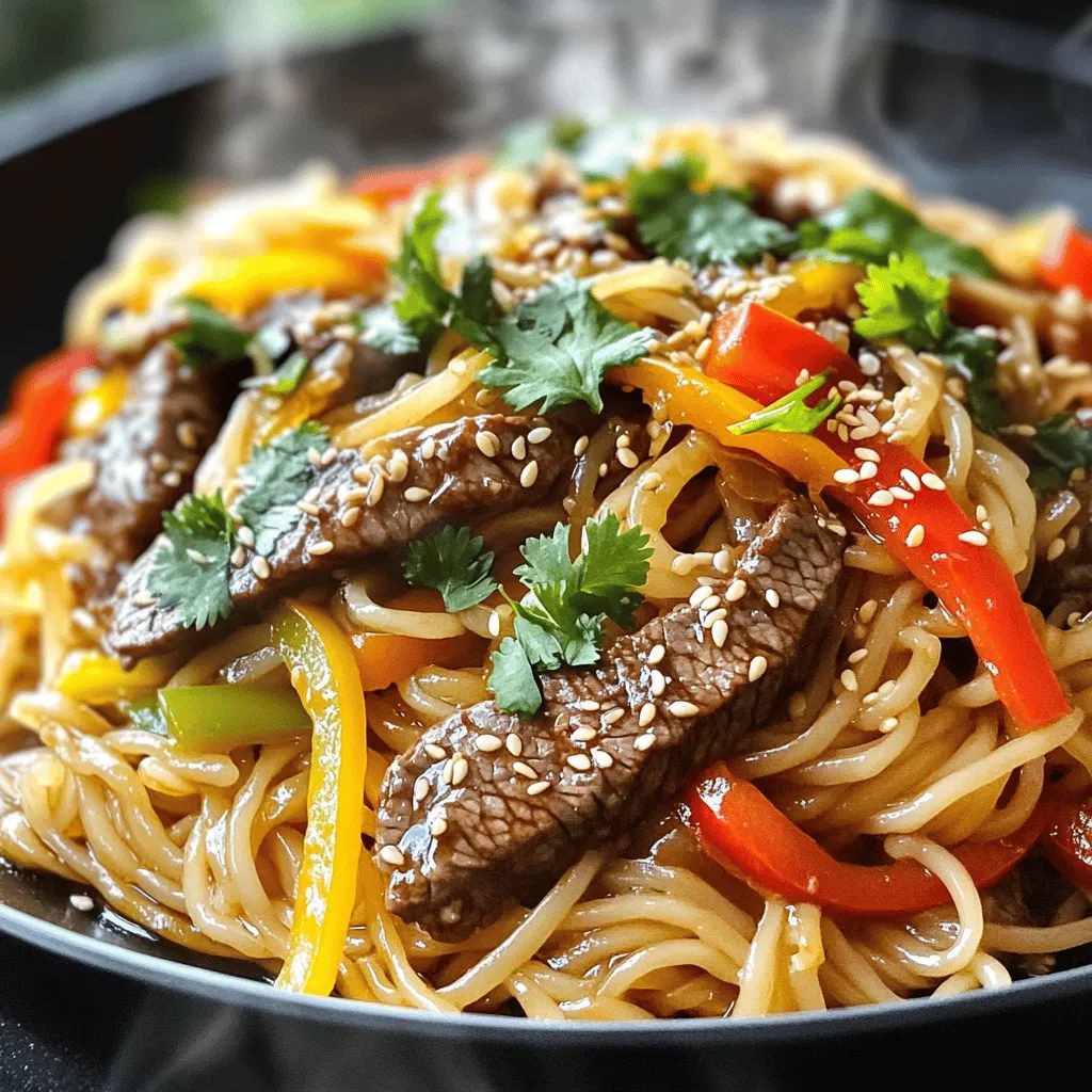Each ingredient plays a role. The rice noodles serve as the base. Flank steak brings protein. Soy sauce adds umami, while sesame oil gives depth. Garlic and ginger provide strong flavors. Green onions and bell pepper add crunch and color.