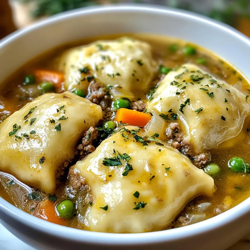 For an attractive serving, arrange the beef filling and dumplings neatly in shallow bowls. Garnish with additional freshly chopped parsley and consider adding a slice of crusty bread on the side for a complete meal experience.