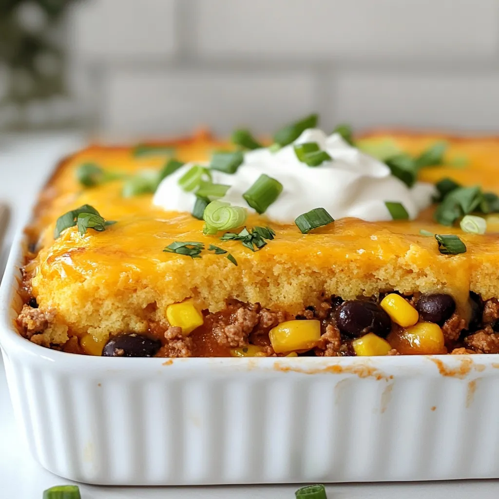 A delicious and easy-to-make taco bake featuring cornbread, seasoned meat, beans, and cheese.