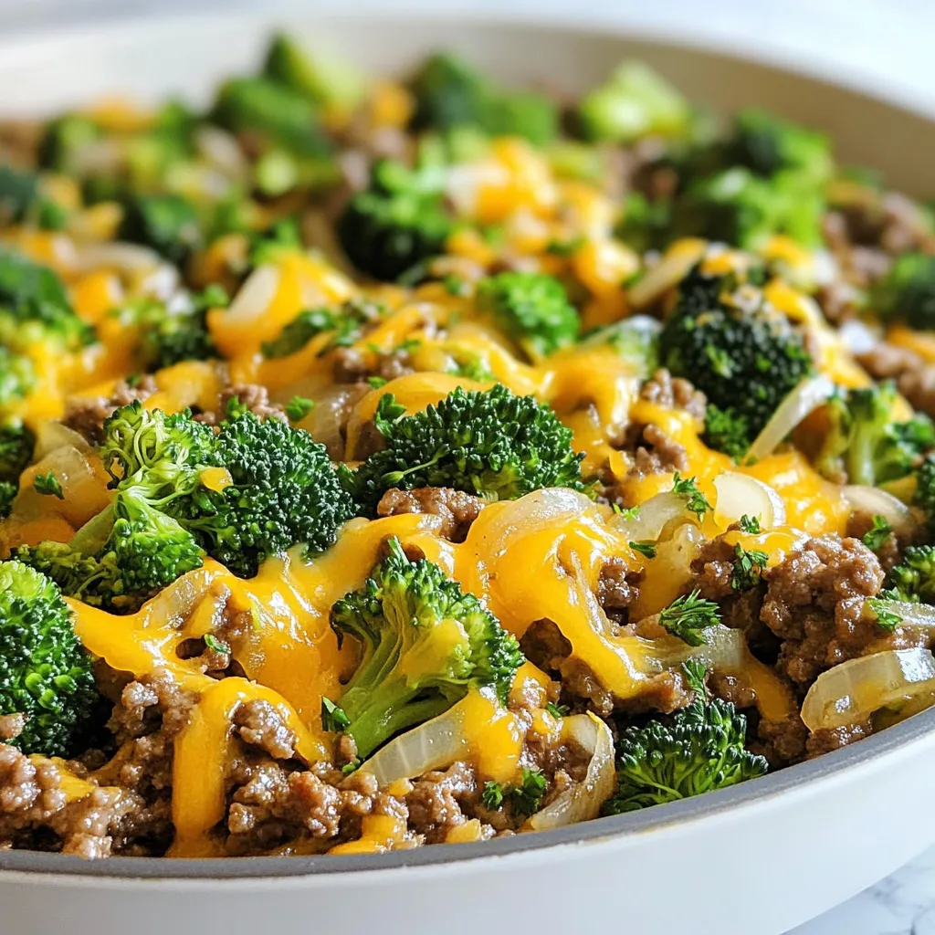 A delicious and low-carb skillet meal featuring ground beef and broccoli, perfect for a keto diet.