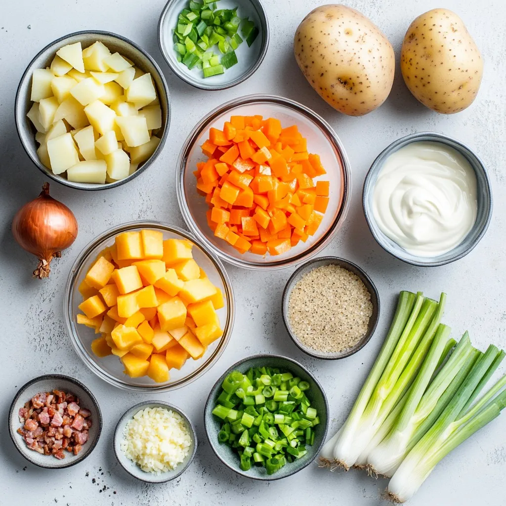 Gathering fresh ingredients is key to a tasty soup. Start with russet potatoes. They give the soup a creamy base. The yellow onion, celery, and carrots add great flavor. You want them diced finely for even cooking.