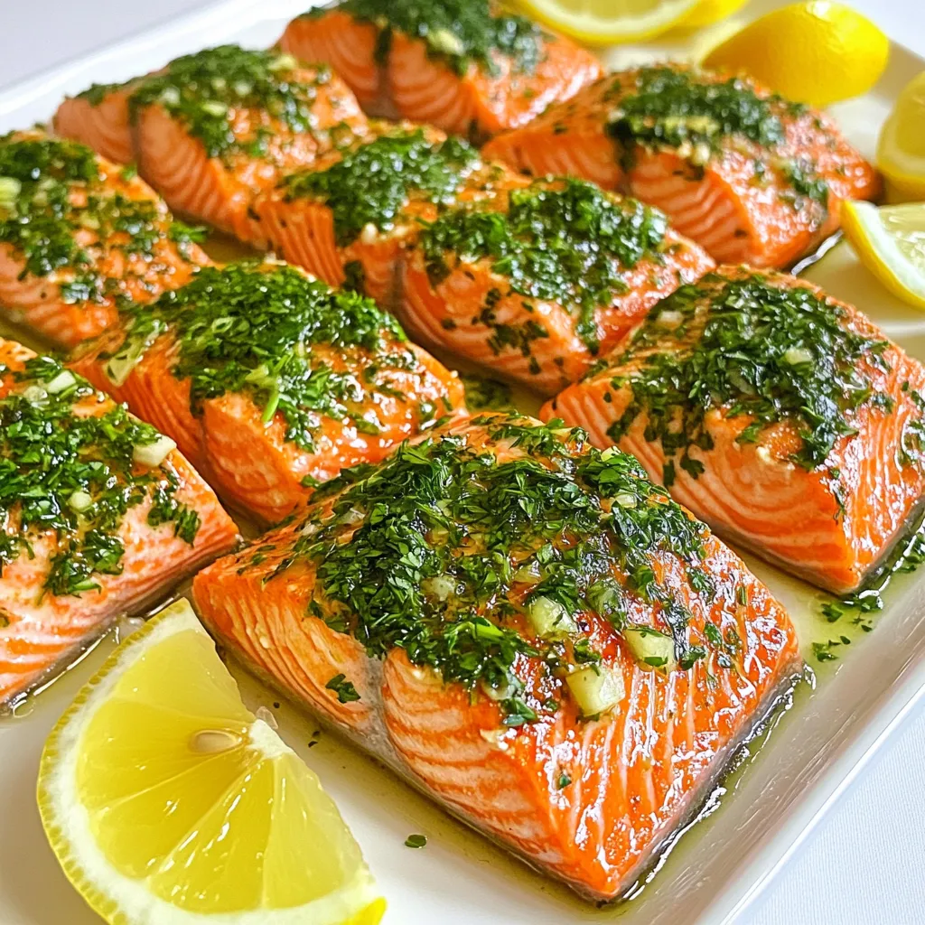 - 4 salmon fillets (6 oz each) - 4 cloves garlic, finely minced - 1/4 cup extra-virgin olive oil - 1 tablespoon fresh lemon juice - 1 teaspoon lemon zest - Fresh herbs: 2 tablespoons parsley, 1 tablespoon dill - 1 teaspoon dried oregano - Salt and black pepper, to taste - Lemon wedges for serving The main ingredients for Marry Me Herb Garlic Salmon are simple yet flavorful. Salmon fillets are rich in omega-3 fatty acids, which support heart health. Garlic adds a punch of flavor while also bringing health benefits, like boosting the immune system. The extra-virgin olive oil is not only healthy but also helps create a lovely crust on the salmon when baked. To enhance the flavor, I use fresh lemon juice and lemon zest. The zest adds a bright citrus note that pairs perfectly with the rich salmon. Fresh herbs like parsley and dill bring color and freshness, making the dish more appealing. Seasonings include dried oregano, salt, and black pepper. They balance the flavors and highlight the natural taste of the salmon. Lemon wedges are perfect for serving, adding a fresh squeeze of juice just before eating. {{ingredient_image_2}} - Preheat oven to 400°F (200°C). - Line a baking sheet with parchment paper for easy cleanup. - In a bowl, combine olive oil, minced garlic, lemon juice, lemon zest, chopped parsley, chopped dill, dried oregano, salt, and black pepper. - Whisk until well blended. The mix should smell bright and fresh. - Place salmon fillets skin-side down on the baking sheet. - Generously coat each fillet with the herb garlic mixture. Make sure every bit is covered for great flavor. - Bake the salmon in the preheated oven for 12 to 15 minutes. - The salmon is done when it flakes easily with a fork and looks opaque. - Let the salmon rest for 1 minute before serving. This helps the flavors deepen. To ensure your salmon is evenly coated, use a brush or spoon. Apply the herb garlic mixture to all sides of each fillet. This way, every bite will burst with flavor. When checking for doneness, look for flakiness and opacity. The salmon should easily flake apart with a fork. If it looks opaque throughout, it’s good to go! For a beautiful plate, decorate with fresh herbs and lemon wedges. Place the baked salmon on a nice platter. Garnish with extra sprigs of parsley and dill for color. Arrange lemon wedges around the salmon. Drizzle any leftover sauce artfully around the plate. This adds a lovely touch and enhances the dish's appeal. For side dishes, serve the salmon with rice or steamed vegetables. Both options complement the flavors well. For a drink, consider a crisp white wine, like Sauvignon Blanc. Its acidity pairs nicely with the rich salmon and bright herbs. Enjoy your meal with great sides and a refreshing drink! Pro Tips Fresh Ingredients Matter: Always use fresh herbs and high-quality salmon for the best flavor and texture. Don’t Overcook: Salmon is best when it’s slightly undercooked in the center; it will continue to cook from residual heat. Experiment with Herbs: Feel free to mix in other herbs like tarragon or basil to give a unique twist to the flavor profile. Serve with Sides: Pair the salmon with roasted vegetables or a light salad to complement the dish beautifully. {{image_4}} You can change the flavor with different marinades. A honey mustard glaze adds a sweet twist. Mix honey, mustard, and a bit of olive oil. Brush it on your salmon before baking. Another option is a spicy sriracha garlic sauce. Combine sriracha, minced garlic, and olive oil. This sauce gives your salmon a bold kick. Brush it on just like the herb garlic mix. You can also try grilling the salmon. Heat your grill and cook the fillets for about 5-6 minutes on each side. This method gives a smoky flavor and beautiful grill marks. Pan-searing is another method. Heat a skillet over medium-high heat and add olive oil. Cook the salmon skin-side down for about 4-5 minutes. Flip it and cook for another 3-4 minutes. This method gives a crispy skin. If you want to switch proteins, use chicken or tofu. For chicken, use thighs or breasts. Marinate them in the same herb garlic mix. Bake them for about 20-25 minutes, or until cooked through. Tofu is great for a plant-based option. Press the tofu to remove excess water. Marinate it like the salmon, then bake for 25-30 minutes. You can also try different fish, like trout or halibut. Adjust the cooking time based on the thickness of the fillets. To keep your leftover Marry Me Herb Garlic Salmon fresh, use an airtight container. This will stop air from drying it out. Make sure to store it in the fridge right after it cools down. You can keep the salmon for up to three days. After that, the taste may not be as good. When reheating salmon, the goal is to keep it moist. The best way is to use the oven. Preheat it to 275°F (135°C). Place your salmon on a baking sheet and cover it with foil. Heat it for about 15 minutes. This will warm it up without drying it out. If you want to save some salmon for later, freezing is a great choice. First, wrap each fillet tightly in plastic wrap. Then, place them in a freezer bag. This helps prevent freezer burn. You can freeze it for up to three months. When you are ready to eat it, thaw the salmon in the fridge overnight. For best quality, avoid using a microwave to thaw. To check if salmon is cooked right, look for a few signs. First, see if the salmon flakes easily with a fork. This means it's done. The color should be opaque, not translucent. Use a meat thermometer if you like. It should read 145°F (63°C) in the thickest part. You can pair this dish with many sides. Rice or quinoa works well. Try roasted vegetables for a healthy option. A fresh salad with lemon dressing can add a nice crunch. Garlic bread is a great choice, too. It soaks up all the tasty juices! Yes, you can swap fresh herbs for dried ones. Use one-third of the amount. For instance, if the recipe calls for 2 tablespoons of fresh parsley, use about 2 teaspoons of