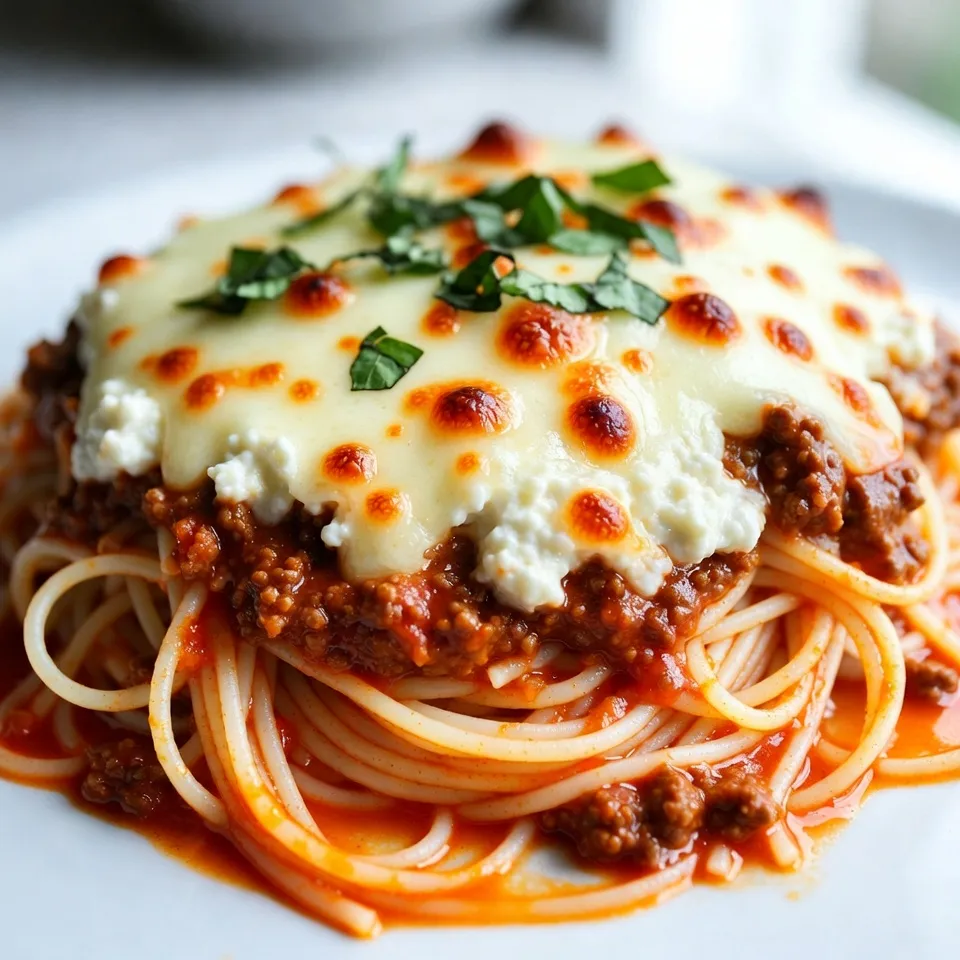 A rich and cheesy baked spaghetti dish that is sure to impress.