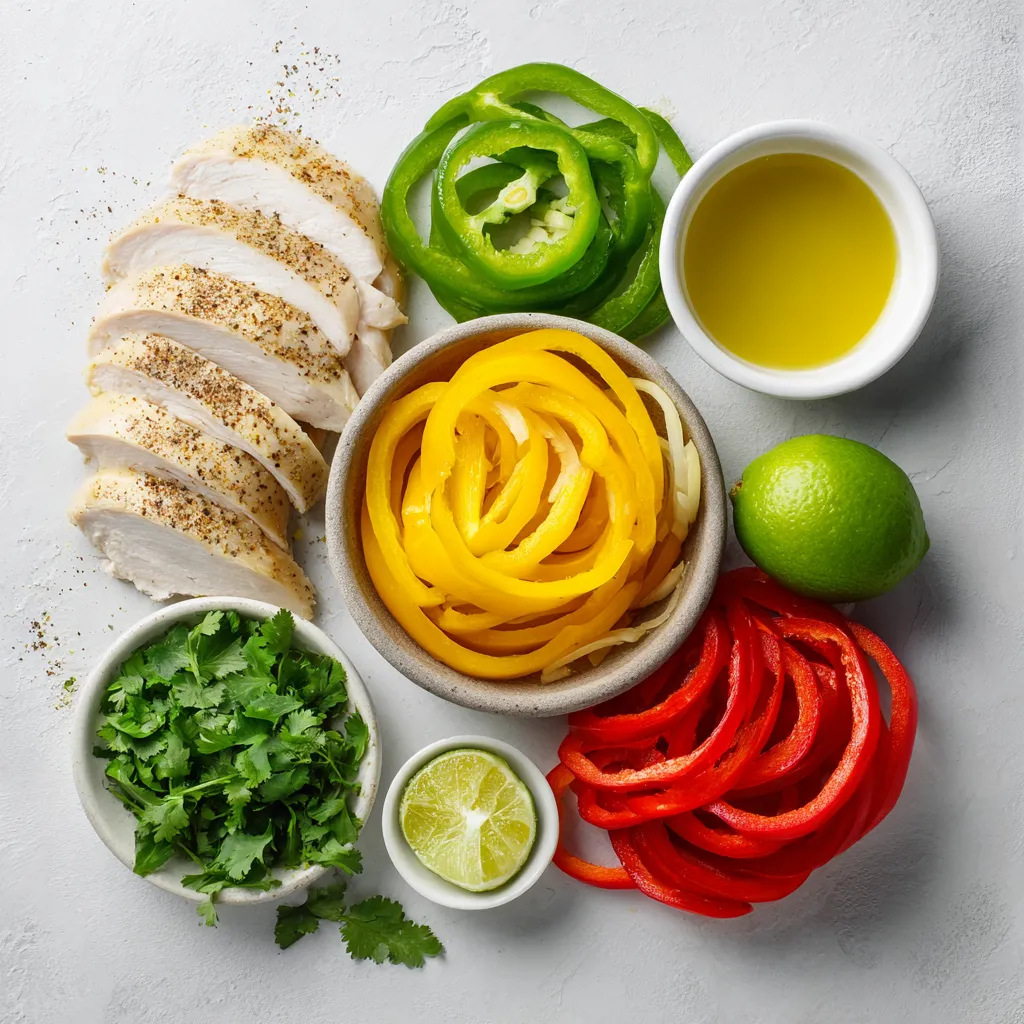 In a large bowl, combine 1 pound of thinly sliced chicken, 1 red bell pepper, 1 green bell pepper, and 1 yellow onion. Cut the peppers into thin strips and the onion into wedges. Drizzle 3 tablespoons of olive oil over the mixture. Add 2 tablespoons of fajita seasoning, the juice of 1 lime, and salt and pepper to taste. Toss everything well so all ingredients are coated. This ensures each bite bursts with flavor.