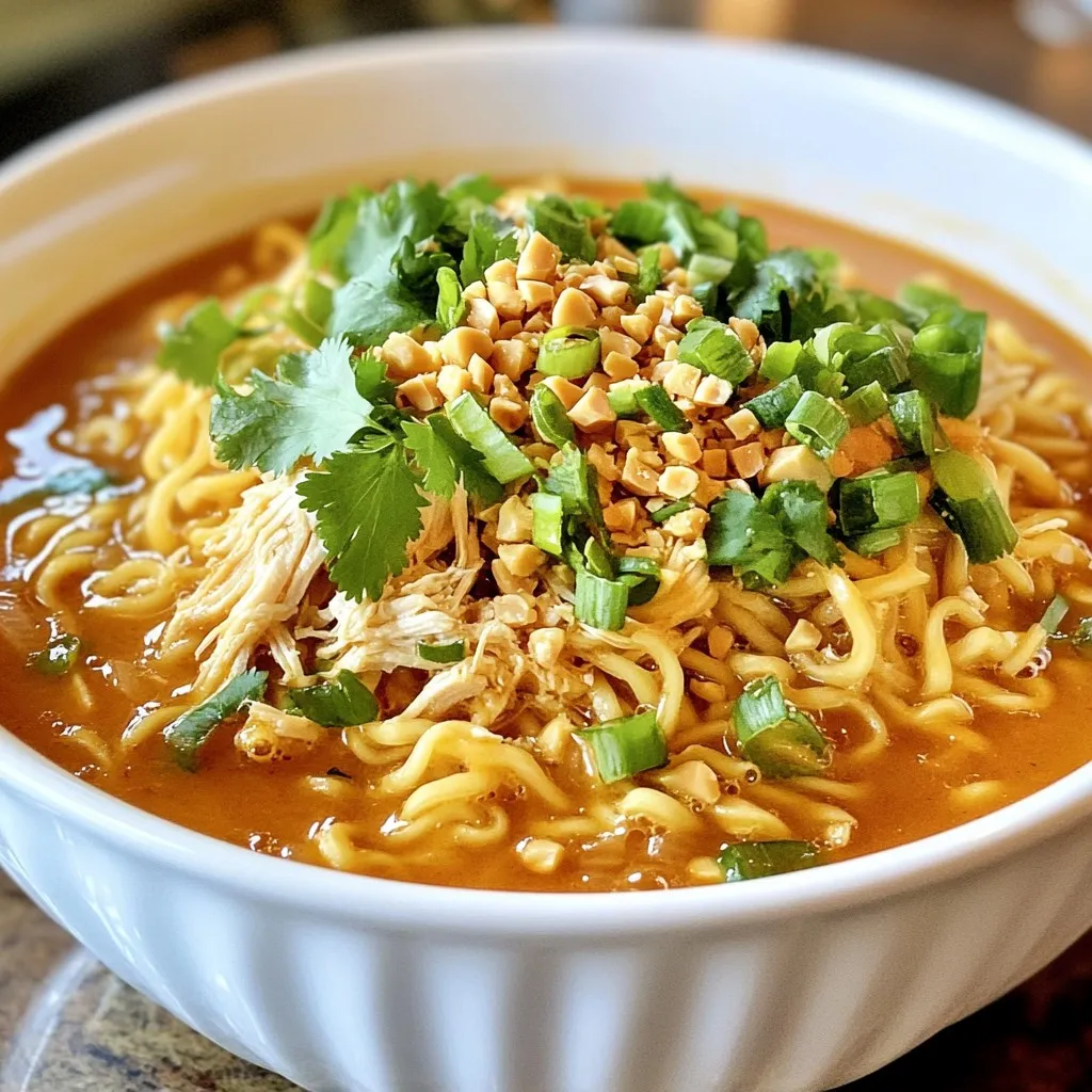 For a beautiful dish, use deep bowls. Ladle the ramen in first, then top with chicken and sauce. Sprinkle chopped green onions and fresh cilantro on top. Add crushed peanuts for crunch. If you like spice, drizzle Sriracha sauce over the dish. This adds color and flavor. Serve it hot for a cozy meal.