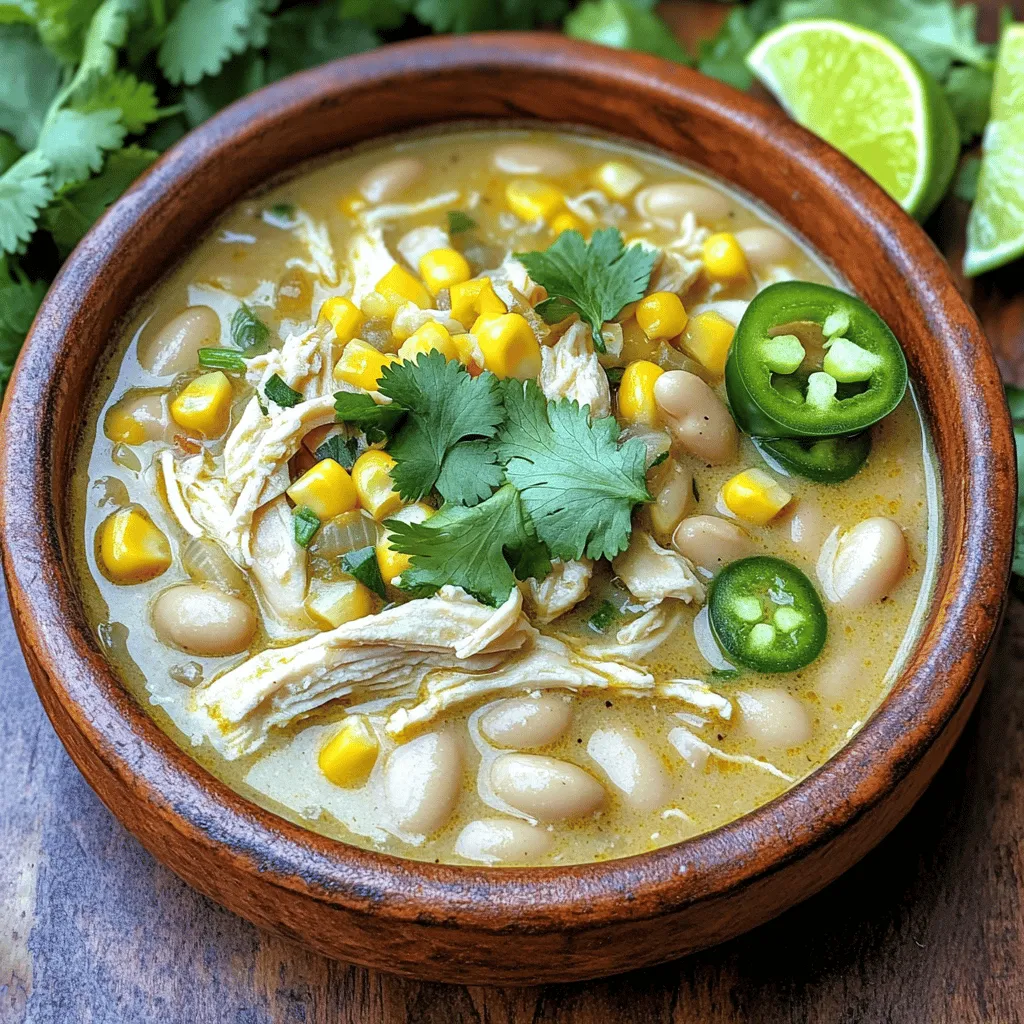 - 1.5 lbs boneless, skinless chicken breasts - 1 medium onion, finely chopped - 2 cloves garlic, minced - 1 can (15 oz) white beans, drained and rinsed - 1 can (15 oz) corn, drained - 1 can (4 oz) diced green chilies - 4 cups chicken broth - 1 teaspoon ground cumin - 1 teaspoon smoked paprika - ½ teaspoon ground coriander - Salt and ground black pepper to taste - 1 cup heavy cream or coconut cream This creamy white chicken chili is all about the right mix of ingredients. I start with the chicken at the bottom. It cooks slowly and stays moist that way. The onion and garlic add a nice kick. They mix well and fill your kitchen with a warm aroma. The white beans and corn add sweetness and texture. The green chilies give it a nice touch of heat without being too spicy. The broth is the base. It brings everything together. I use chicken broth for a rich flavor. The seasonings, like cumin and smoked paprika, add depth. They work together for a nice, balanced taste. Finally, I add cream. It makes the chili rich and creamy. You can use coconut cream if you want a lighter option. It still tastes great! Each ingredient plays a role in making this dish a favorite for many. Start by placing the chicken breasts at the bottom of your slow cooker. This layer is important for even cooking. Next, sprinkle the chopped onion and minced garlic over the chicken. This adds great flavor to the dish. Now, layer in the drained white beans, corn, and diced green chilies. This colorful mix makes the chili more appealing. Carefully pour the chicken broth on top of the layers. It helps cook everything evenly. Finally, add the ground cumin, smoked paprika, ground coriander, salt, and pepper. This mix of spices gives the chili its unique taste. Now it's time to cook! Cover the slow cooker and set it to low for 7-8 hours or high for 4-5 hours. Cooking on low helps the flavors blend well. The chicken should be tender enough to shred easily. Check after the time is up to ensure it's cooked through. After cooking, use tongs to take out the chicken breasts. Place them on a cutting board. Shred the chicken with two forks until fluffy. Return the shredded chicken to the slow cooker and stir it into the mix. Next, stir in the heavy cream or coconut cream. Let it warm for an extra 10-15 minutes on low, stirring now and then. Before serving, taste the chili. Adjust the seasoning by adding more salt and pepper if needed. Serve hot, garnished with chopped cilantro, and add jalapeños and lime wedges for a fresh touch. To boost the taste of your chili, consider adding spices. Try cayenne pepper for a kick. A dash of oregano or thyme can also add depth. If you like it spicy, slice fresh jalapeños and mix them in. They add heat and a fresh taste. When shredding chicken, use two forks. This method breaks apart the meat well. For creaminess, you can adjust the amount of heavy cream. Start with one cup, then add more if you want it richer. Coconut cream is a great choice for a lighter option. Garnish each bowl with fresh cilantro. It adds color and flavor. If you love heat, top with sliced jalapeños. Serve lime wedges on the side for a zesty touch. Pair your chili with crusty bread or a side salad for a full meal. {{image_4}} You can easily modify this recipe to fit your diet. If you want a dairy-free option, use coconut cream instead of heavy cream. It adds a nice, rich taste. Just swap one cup of heavy cream for one cup of coconut cream. For a vegetarian version, skip the chicken. Use two cans of beans instead. White beans work great, but you can mix it up. Try black beans or kidney beans for a different flavor. Sometimes you may not have all the ingredients. No worries! You can swap white beans for chickpeas or lentils. Each will give a unique taste and texture. If you want to change the corn, use frozen peas or diced bell peppers. They add color and sweetness. You can also adjust the spices. Add more cumin for a stronger flavor. Or, include a pinch of chili powder for a bit of heat. Adding local chili peppers can give this dish a fun twist. If you love spice, try using jalapeños or Anaheim peppers. They bring a nice kick without being too hot. You can also switch the meat. Instead of chicken, use turkey for a lighter option. Or, try shrimp for a seafood flair. This will change the flavor but keep it delicious! To store your creamy white chicken chili, let it cool down first. Place it in a clean, airtight container. This helps keep the flavors fresh. You can store it in the fridge for up to four days. However, it tastes best when you eat it within two days. If you want to keep the chili longer, freezing is a great option. First, let it cool completely. Then, scoop it into freezer-safe bags or containers. Leave some space for the chili to expand. You can freeze it for up to three months. To thaw, move it to the fridge overnight. This keeps it from losing flavor and texture. When you’re ready to eat the chili, reheat it gently. The best method is to use a pot on the stove. Heat it over medium-low heat, stirring often. This way, it warms evenly without overcooking. If you use a microwave, do it in short bursts. Stir after each burst to avoid hot spots. Enjoy your meal again without losing that creamy goodness! To add spice, try these options: - Add sliced jalapeños to the mix. - Use hot diced green chilies instead of mild ones. - Mix in some cayenne pepper or chili powder. These suggestions help bring heat without taking over the dish. Yes, you can! Prepare the chili up to the cooking step. - Store the uncooked ingredients in the fridge for up to a day. - You can also freeze them for later use. When ready, just cook in the slow cooker. This makes meal prep easy. For a complete meal, consider these pairings: - Serve with warm, crusty bread or cornbread. - Top the chili with shredded cheese or sour cream. - Fresh lime wedges add a zesty touch. - Cilantro and sliced jalapeños are great for garnishing. Yes, you can use frozen chicke