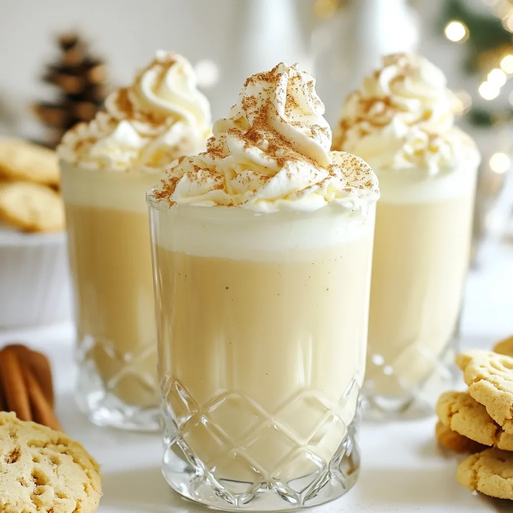 A creamy and festive drink combining rich eggnog and vanilla almond milk, topped with whipped cream and crushed sugar cookies.