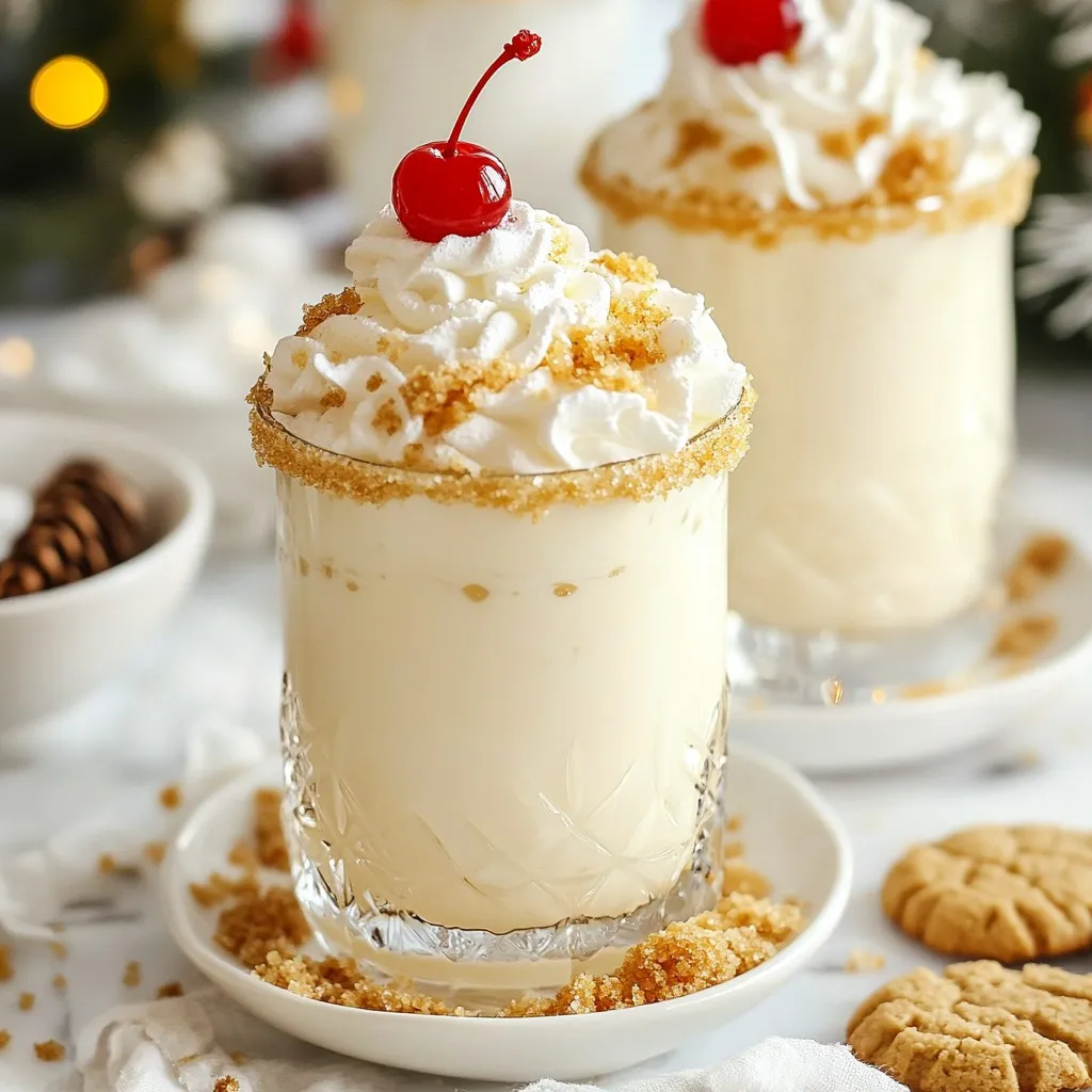 Time to assemble your cocktail! Fill each glass with crushed ice. This keeps your drink cold and refreshing. Slowly pour the eggnog mixture over the ice. Fill each glass about three-quarters full. This allows the flavors to blend nicely. Next, add a generous dollop of whipped cream on top. This makes the drink feel rich and indulgent. Finally, sprinkle extra crushed sugar cookies on top. Add a maraschino cherry for color and fun. Serve these drinks right away to enjoy a festive treat!