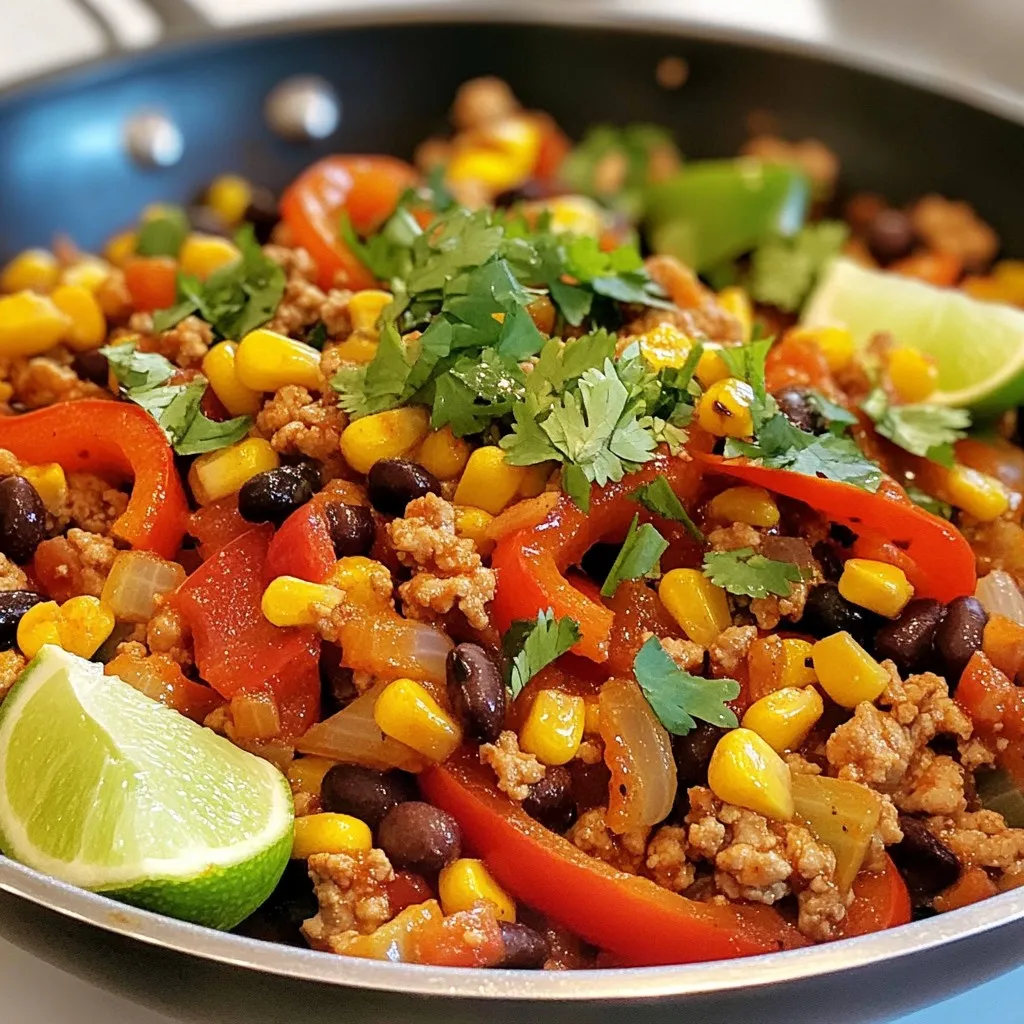 Next, add one diced red bell pepper and one diced green bell pepper. Sauté these for four to five minutes. This makes them soft and tender. Now, fold in one can of rinsed black beans and one cup of corn. Cook everything for another three to four minutes to blend the flavors. Finally, squeeze the juice of one lime over the skillet. Stir well to combine. Taste your dish and adjust the seasoning if needed. Serve hot, garnished with fresh cilantro leaves. Enjoy your flavorful Turkey and Pepper Skillet!