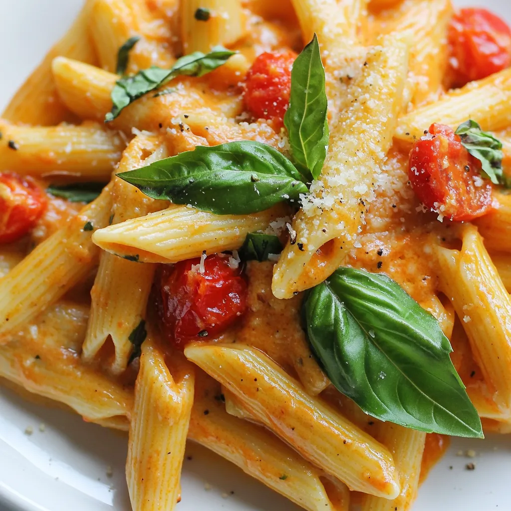 A delicious vegan pasta dish with a creamy tomato sauce, perfect for a comforting meal.